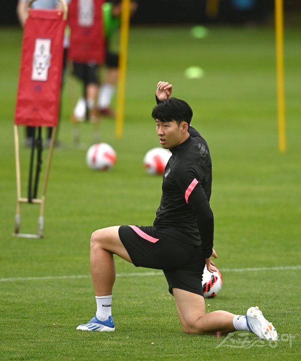 6월 A매치 기간 4차례의 평가전을 앞둔 한국 축구대표팀이 30일 파주국가대표트레이닝센터(NFC)에 소집되어 오픈트레이닝으로 진행됐다. 손흥민이 스트레칭을 하고 있다.