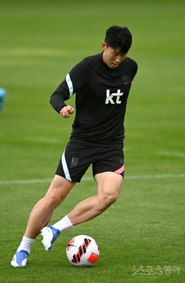 6월 A매치 기간 4차례의 평가전을 앞둔 한국 축구대표팀이 30일 파주국가대표트레이닝센터(NFC)에 소집되어 오픈트레이닝으로 진행됐다. 손흥민이 드리블을 하고 있다.