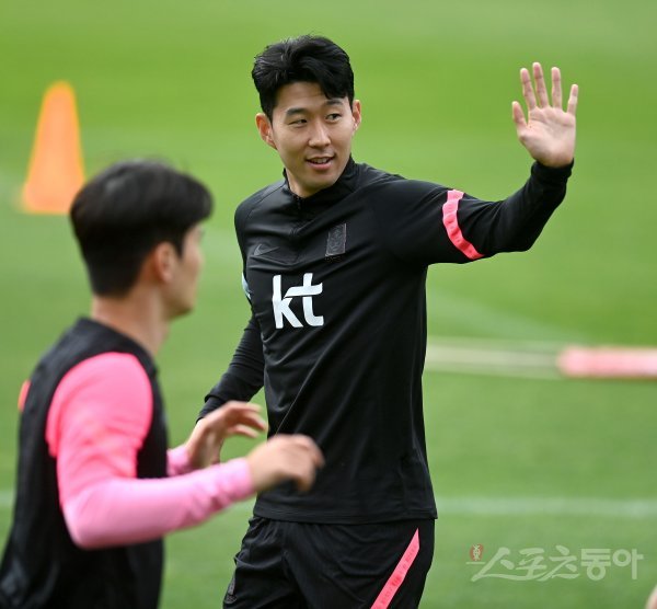 6월 A매치 기간 4차례의 평가전을 앞둔 한국 축구대표팀이 30일 파주국가대표트레이닝센터(NFC)에 소집되어 오픈트레이닝으로 진행됐다. 손흥민이 팬들에게 손을 흔들고 있다.