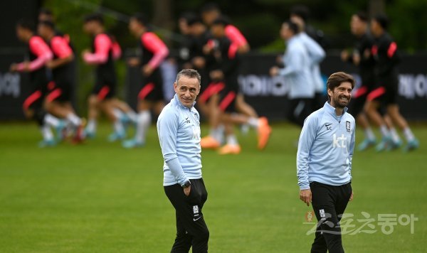 6월 A매치 기간 4차례의 평가전을 앞둔 한국 축구대표팀이 30일 파주국가대표트레이닝센터(NFC)에 소집되어 오픈트레이닝으로 진행됐다. 벤투 감독이 훈련장을 바라보고 있다.