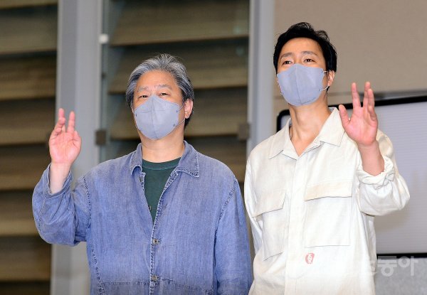 제 75회 칸국제영화제에서 영화 ‘헤어질 결심’으로 감독상을 수상한 박찬욱 감독이 박해일과 함께 30일 인천국제공항을 통해 귀국해 포즈를 취하고 있다.