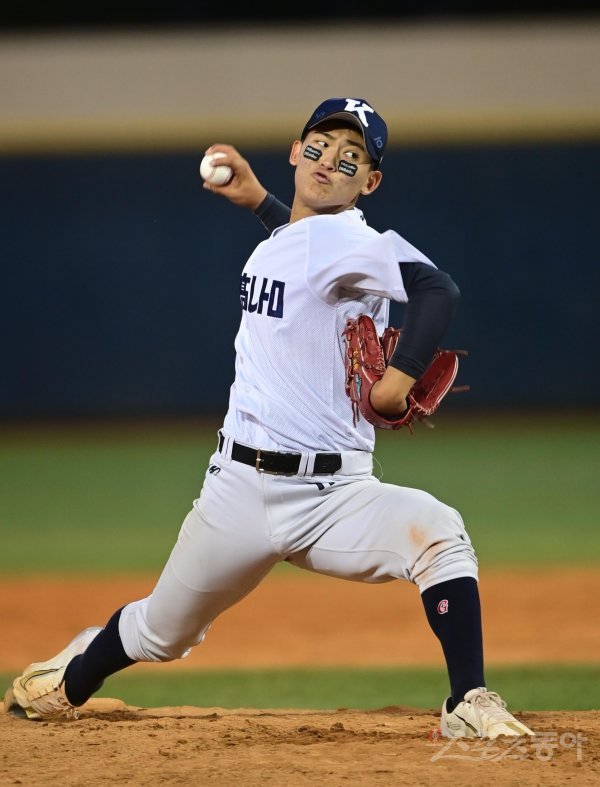 30일 서울 목동야구장에서 열린 ‘제76회 황금사자기 전국고교야구대회 겸 주말리그 왕중왕전’ 경남고와 청담고의 결승전 경기에서 선발 투수로 마운드에 오른 경남고 신영우가 역투하고 있다.