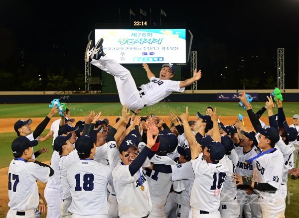 30일 서울 목동야구장에서 열린 ‘제76회 황금사자기 전국고교야구대회 겸 주말리그 왕중왕전’ 경남고와 청담고의 결승전 경기에서 청담고에 7-2로 승리해 우승을 확정지은 경남고 전광열 감독이 선수들의 헹가래를 받고 있다.