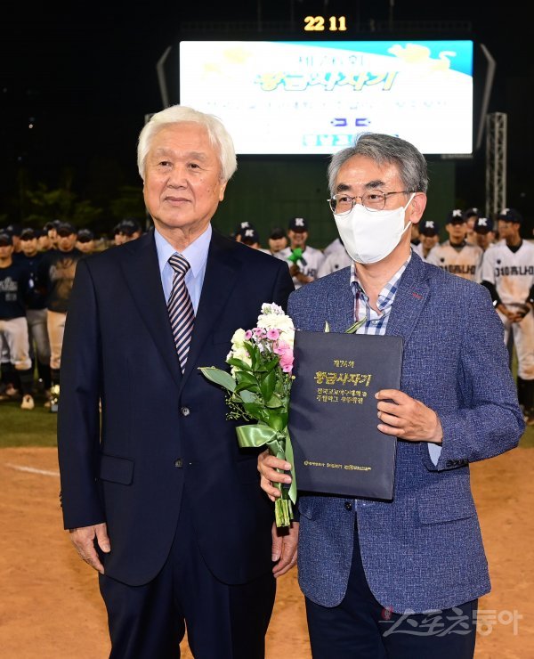 30일 서울 목동야구장에서 열린 ‘제76회 황금사자기 전국고교야구대회 겸 주말리그 왕중왕전’ 경남고와 청담고의 결승전 경기에서 우승을 차지한 경남고 백영선 교장이 공로상을 수상해 기념 촬영을 하고 있다.