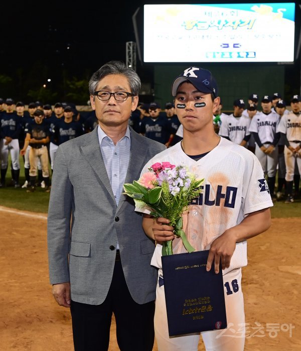30일 서울 목동야구장에서 열린 ‘제76회 황금사자기 전국고교야구대회 겸 주말리그 왕중왕전’ 경남고와 청담고의 결승전 경기에서 우승을 차지한 경남고 강민성이 수훈상을 수상해 양해영 대한야구소프트볼협회 부회장과 기념 촬영을 하고 있다.
