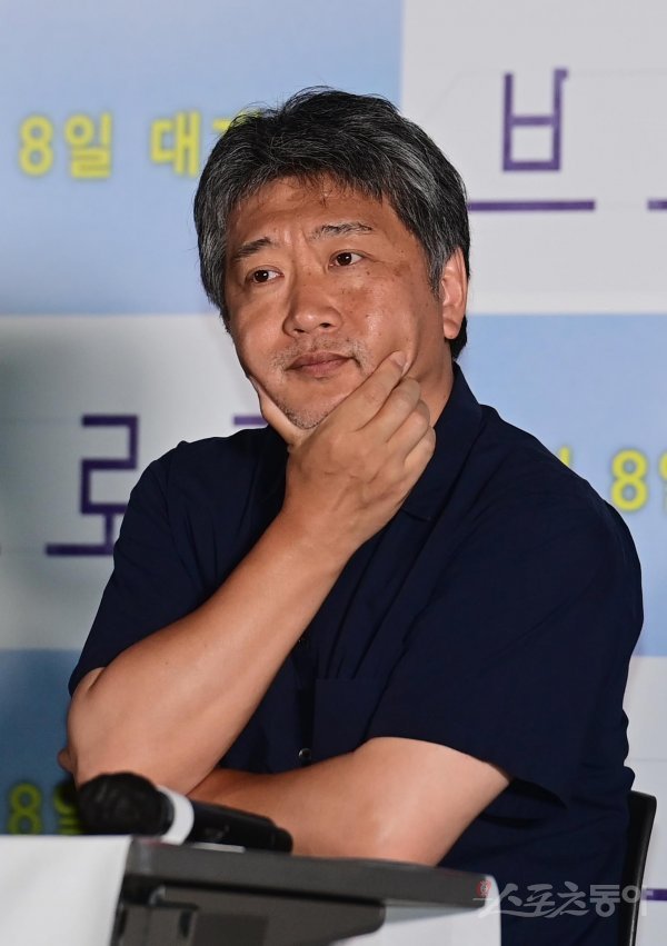 고레에다 히로카즈 감독이 31일 서울 용산구 CGV용산아이파크몰점에서 열린 영화 ‘브로커’ 언론시사회에서 취재진의 질문을 듣고 있다.