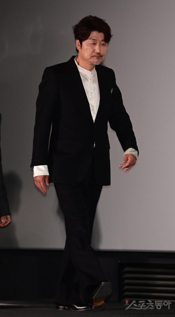 배우 송강호가 31일 서울 용산구 CGV용산아이파크몰점에서 열린 영화 ‘브로커’ 언론시사회 무대에 오르고 있다.
