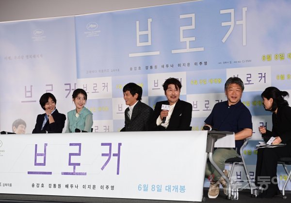 31일 서울 용산구 CGV용산아이파크몰점에서 열린 영화 ‘브로커’ 언론시사회에서 배우 이주영, 이지은, 강동원, 송강호, 고레에다 히로카즈 감독이 웃고 있다.