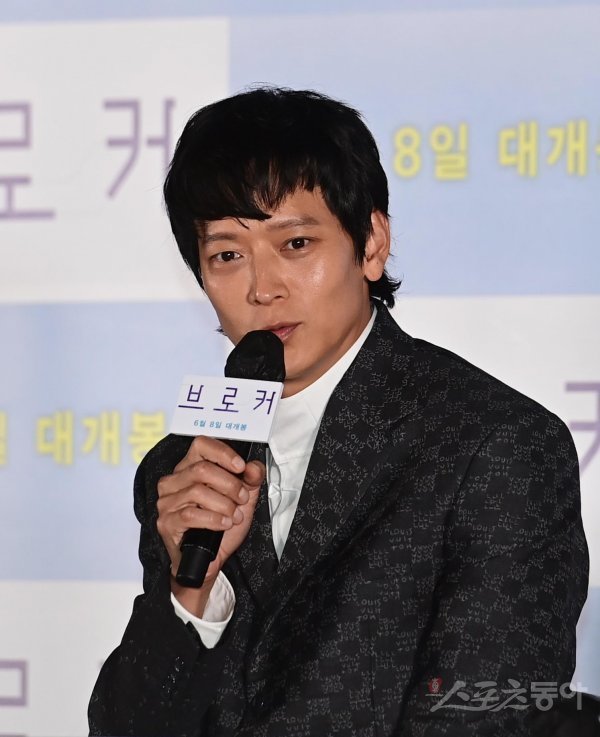 배우 강동원이 31일 서울 용산구 CGV용산아이파크몰점에서 열린 영화 ‘브로커’ 언론시사회에서 인사말을 하고 있다.