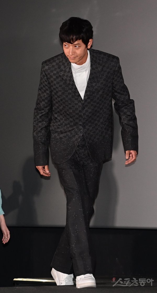 배우 강동원이 31일 서울 용산구 CGV용산아이파크몰점에서 열린 영화 ‘브로커’ 언론시사회 무대에 오르고 있다.