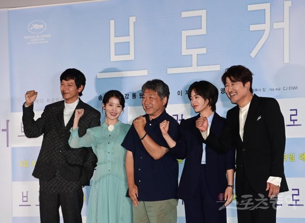 배우 강동원, 이지은, 고레에다 히로카즈 감독, 이주영, 송강호가 31일 서울 용산구 CGV용산아이파크몰점에서 열린 영화 ‘브로커’ 언론시사회에서 포즈를 취하고 있다.
