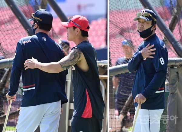1일 서울 잠실야구장에서 열린 ‘2022 신한은행 SOL KBO리그’ 두산 베어스와 KIA 타이거즈의 경기에 앞서 두산 강석천 코치가 KIA 류지혁의 인사에 뒤돌아보고 있다.