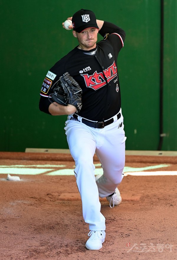 1일 인천 SSG 랜더스필드에서 ‘2022 신한은행 SOL KBO리그’ SSG 랜더스와 kt 위즈의 경기가 열린다. 경기 전 kt 새 용병 투수 벤자민이 불펜 투구를 펼치고 있다.