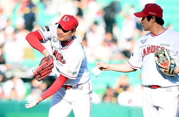 1일 인천 SSG 랜더스필드에서 ‘2022 신한은행 SOL KBO리그’ SSG 랜더스와 kt 위즈의 경기가 열렸다. 3회초 SSG 선발 김광현이 kt 공격을 막은 후 상대 타자의 타격을 설명하고 있다.
