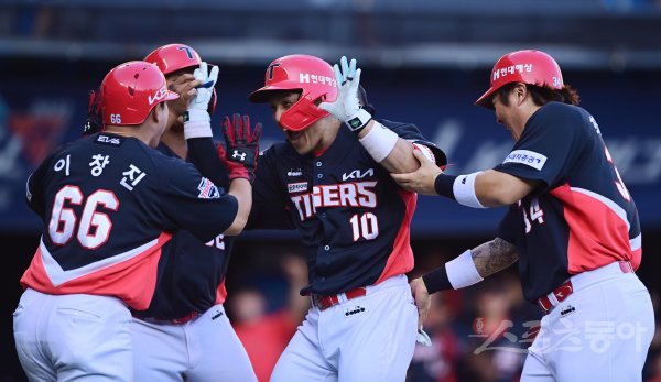1일 서울 잠실야구장에서 열린 ‘2022 신한은행 SOL KBO리그’ 두산 베어스와 KIA 타이거즈의 경기에서 4회초 1사 만루 KIA 박동원이 좌월 만루 홈런을 쳐낸 후 동료들과 기쁨을 나누고 있다.