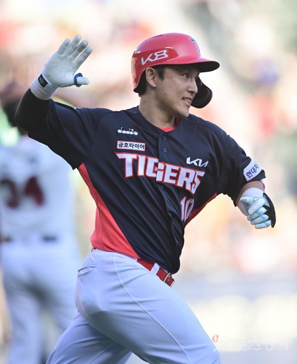 1일 서울 잠실야구장에서 열린 ‘2022 신한은행 SOL KBO리그’ 두산 베어스와 KIA 타이거즈의 경기에서 4회초 1사 만루 KIA 박동원이 좌월 만루 홈런을 쳐낸 후 세리머니를 하고 있다.