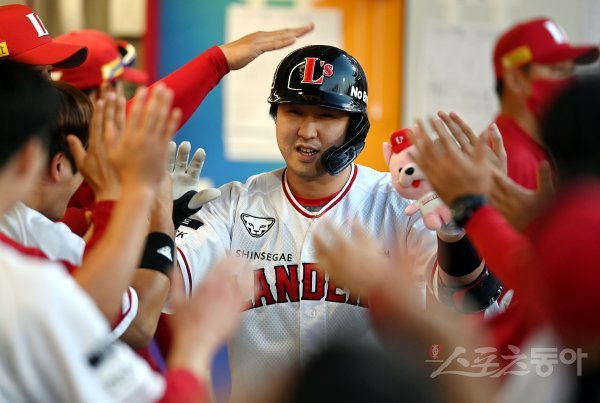 1일 인천 SSG 랜더스필드에서 ‘2022 신한은행 SOL KBO리그’ SSG 랜더스와 kt 위즈의 경기가 열렸다. 8회말 2사에서 SSG 최정이 솔로 홈런을 쏘아 올린 후 동료들의 환영을 받고 있다.