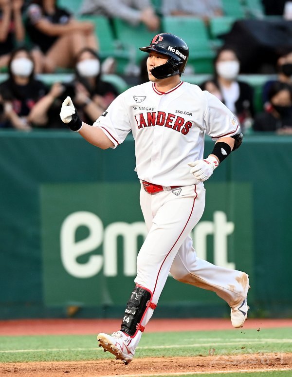 1일 인천 SSG 랜더스필드에서 ‘2022 신한은행 SOL KBO리그’ SSG 랜더스와 kt 위즈의 경기가 열렸다. 8회말 2사에서 SSG 최정이 솔로 홈런을 쏘아 올린 후 그라운드를 돌며 세리머니를 펼치고 있다.