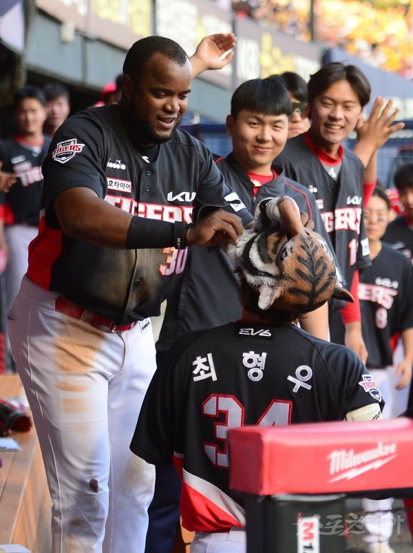 1일 서울 잠실야구장에서 열린 ‘2022 신한은행 SOL KBO리그’ 두산 베어스와 KIA 타이거즈의 경기에서 6회초 무사 KIA 소크라테스가 솔로 홈런을 쳐낸 최형우에게 호랑이 탈을 씌워주고 있다.