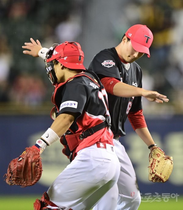 1일 서울 잠실야구장에서 열린 ‘2022 신한은행 SOL KBO리그’ 두산 베어스와 KIA 타이거즈의 경기에서 두산에 7-3으로 승리한 KIA 정해영이 포수와 기쁨을 나누고 있다.
