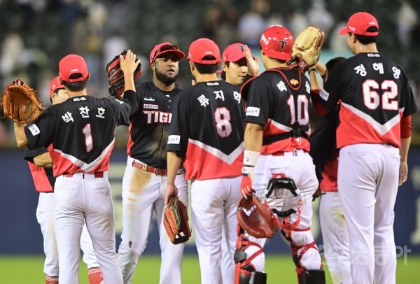 1일 서울 잠실야구장에서 열린 ‘2022 신한은행 SOL KBO리그’ 두산 베어스와 KIA 타이거즈의 경기에서 두산에 7-3으로 승리한 KIA 선수들이 기쁨을 나누고 있다.