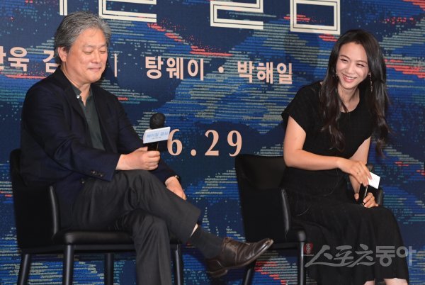 박찬욱 감독과 배우 탕웨이가 2일 서울 종로구 JW메리어트동대문스퀘어서울에서 열린 영화 ‘헤어질 결심’ 제작보고회에서 답변을 마친 후 웃고 있다.