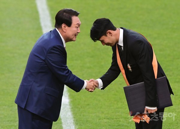 이후 윤석열 대통령은 손흥민 가슴에 청룡장을 직접 달아줬다. 윤석열 대통령은 손흥민에게 악수를 청했고, 손흥민은 허리를 숙이며 화답했다.