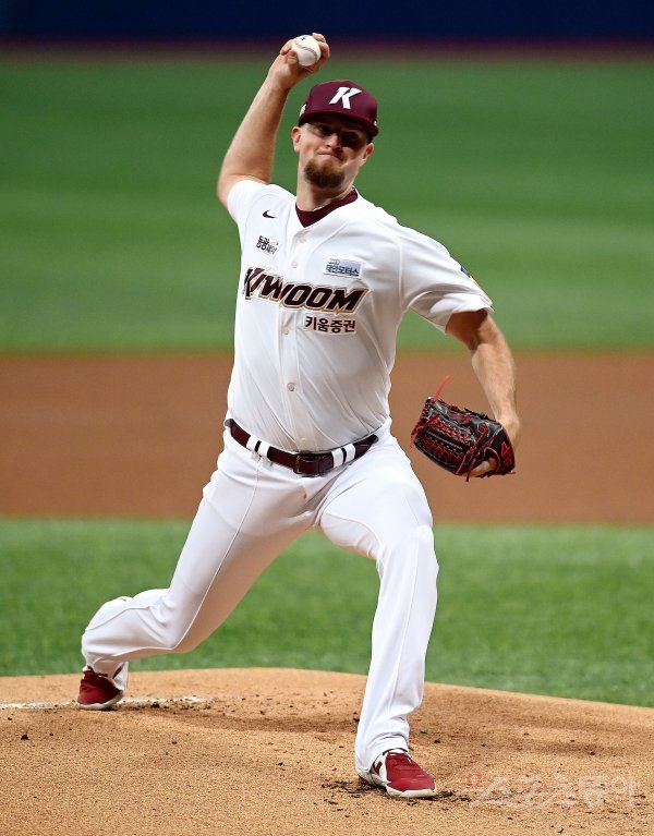 2일 서울 고척스카이돔에서 ‘2022 신한은행 SOL KBO리그’ 키움 히어로즈와 삼성 라이온즈의 경기가 열렸다. 키움 선발투수 애플러가 힘차게 볼을 던지고 있다.