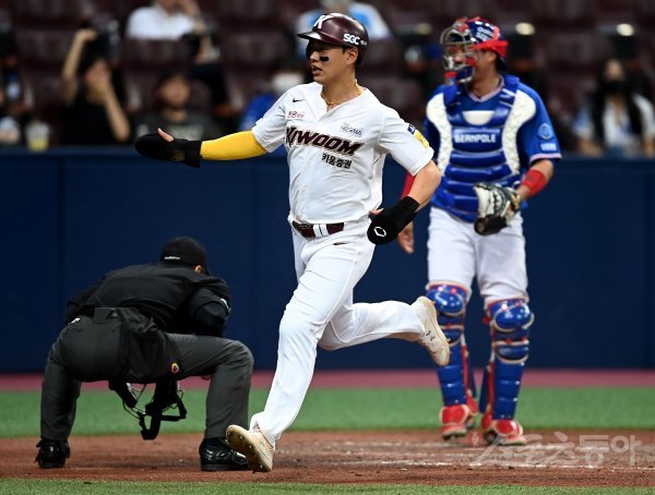 2일 서울 고척스카이돔에서 ‘2022 신한은행 SOL KBO리그’ 키움 히어로즈와 삼성 라이온즈의 경기가 열렸다. 4회말 2사 1, 2루에서 적시타 때 키움 1루 주자 송성문이 상대 실책으로 득점을 올리고 있다.