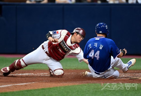 2일 서울 고척스카이돔에서 ‘2022 신한은행 SOL KBO리그’ 키움 히어로즈와 삼성 라이온즈의 경기가 열렸다. 4회초 1사 1, 3루에서 내야땅볼 때 키움 이지영이 홈으로 파고들던 삼성 오재일을 태그 아웃시키고 있다.
