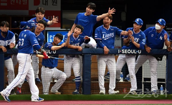 2일 서울 고척스카이돔에서 ‘2022 신한은행 SOL KBO리그’ 키움 히어로즈와 삼성 라이온즈의 경기가 열렸다. 5회초 2사 1루에서 삼성 피렐라가 역전 투런 홈런을 쏘아 올린 후 동료들의 환영을 받고 있다.