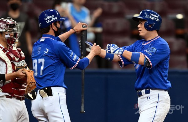 2일 서울 고척스카이돔에서 ‘2022 신한은행 SOL KBO리그’ 키움 히어로즈와 삼성 라이온즈의 경기가 열렸다. 6회초 무사에서 삼성 이원석이 솔로 홈런을 쏘아 올린 후 코치의 환영을 받고 있다.