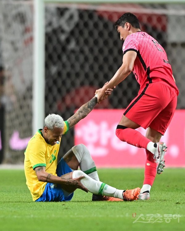 2일 서울월드컵경기장에서 열린 ‘하나은행 초청 축구국가대표팀 친선경기’ 한국과 브라질의 경기에서 브라질 네이마르가 한국 정우영에게 태클을 당한 후 통증을 호소하고 있다.