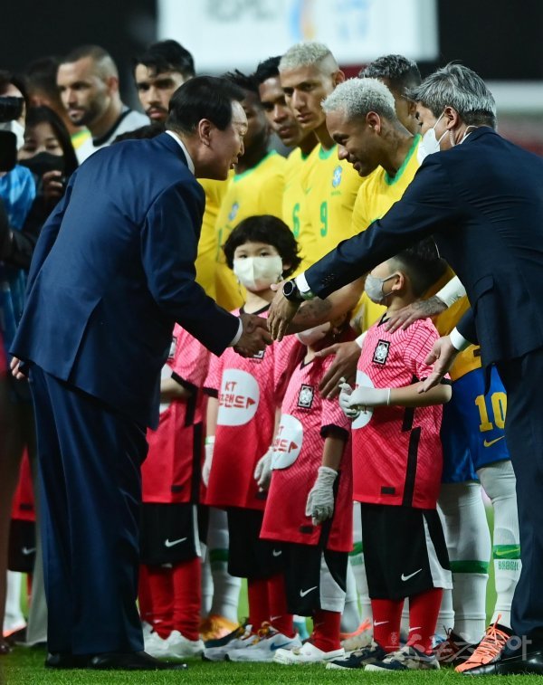 2일 서울월드컵경기장에서 열린 ‘하나은행 초청 축구국가대표팀 친선경기’ 한국과 브라질의 경기에 앞서 윤석열 대통령이 브라질 네이마르와 인사하고 있다.