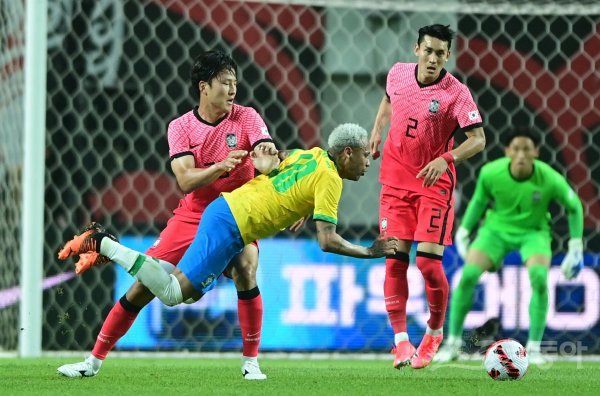 2일 서울월드컵경기장에서 열린 ‘하나은행 초청 축구국가대표팀 친선경기’ 한국과 브라질의 경기에서 한국 권경원이 브라질 네이마르와 몸싸움을 하고 있다.