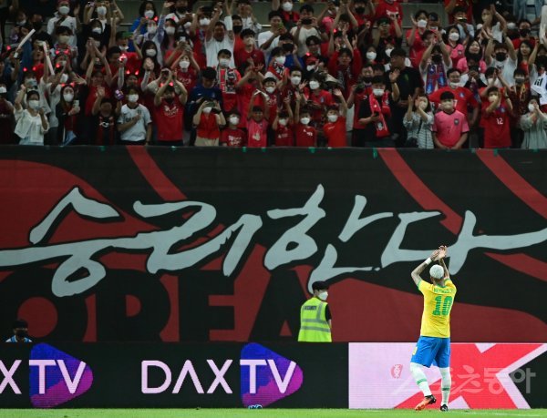 2일 서울월드컵경기장에서 열린 ‘하나은행 초청 축구국가대표팀 친선경기’ 한국과 브라질의 경기에서 브라질 네이마르가 페널티킥을 성공시킨 후 한국 관중을 향해 손뼉을 치고 있다.