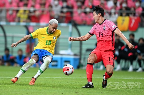 2일 서울월드컵경기장에서 열린 한국축구대표팀과 브라질 경기에서 브라질 네이마르가 한국 김영권의 수비를 뚫고 공격하고 있다.