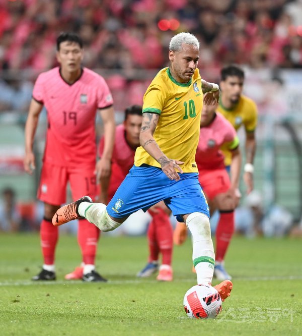 2일 서울월드컵경기장에서 열린 한국축구대표팀과 브라질 경기에서 브라질 네이마르가 패널티킥을 성공시키고있다.