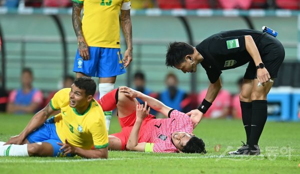 2일 서울월드컵경기장에서 열린 한국축구대표팀과 브라질 경기에서 한국 손흥민이 브라질 타이고 실바와 충돌해 넘어져 있다.