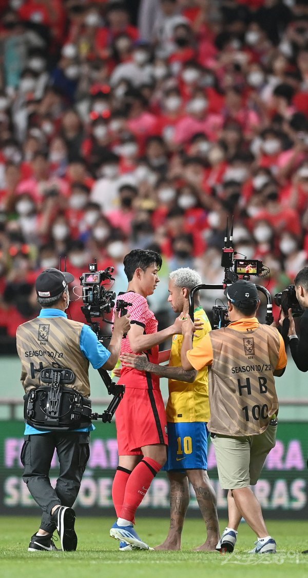 2일 서울월드컵경기장에서 열린 한국축구대표팀과 브라질 경기을 마친 후 한국 손흥민과 브라질 네이마르가 인사를 나누고 있다.