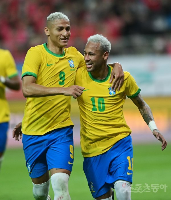 2일 서울월드컵경기장에서 열린 ‘하나은행 초청 축구국가대표팀 친선경기’ 한국과 브라질의 경기에서 브라질 네이마르가 페널티킥으로 세 번째 골을 성공시킨 후 히샬로송과 기쁨을 나누고 있다.