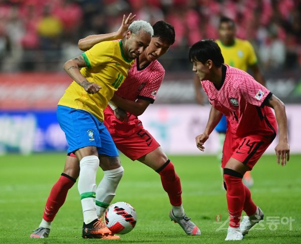 2일 서울월드컵경기장에서 열린 ‘하나은행 초청 축구국가대표팀 친선경기’ 한국과 브라질의 경기에서 브라질 네이마르가 한국 정우영과 홍철의 앞에서 개인기를 펼치고 있다. 상암 | 주현희 기자 teth1147@donga.com