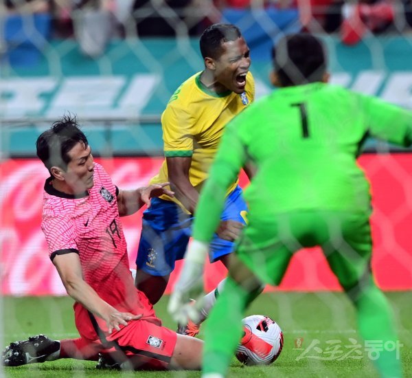 2일 서울월드컵경기장에서 열린 ‘하나은행 초청 축구국가대표팀 친선경기’ 한국과 브라질의 경기에서 한국 김영권이 브라질 산드로에게 반칙을 범하고 있다.