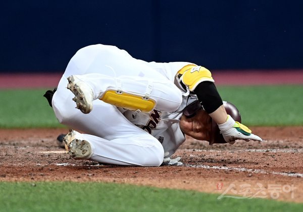 2일 서울 고척스카이돔에서 ‘2022 신한은행 SOL KBO리그’ 키움 히어로즈와 삼성 라이온즈의 경기가 열렸다. 8회말 2사 2, 3루에서 키움 김준완이 투구에 맞은 후 고통을 호소하고 있다.