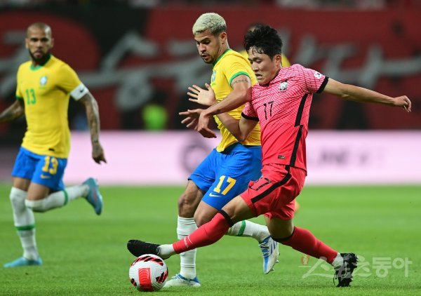 2일 서울월드컵경기장에서 열린 ‘하나은행 초청 축구국가대표팀 친선경기’ 한국과 브라질의 경기에서 한국 나상호가 브라질 기마랑이스와 몸싸움을 하고 있다.