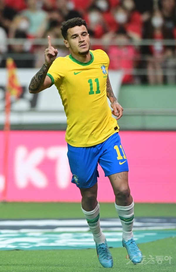 2일 서울월드컵경기장에서 열린 ‘하나은행 초청 축구국가대표팀 친선경기’ 한국과 브라질의 경기에서 브라질 쿠티뉴가 네 번째 골을 성공시킨 후 세리머니를 하고 있다.