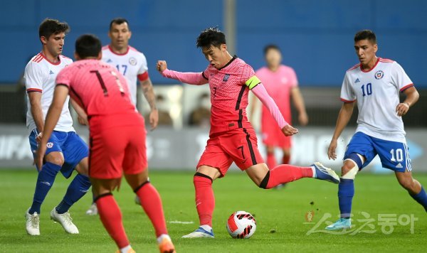 6일 대전월드컵경기장에서 열린 한국축구대표팀과 칠레의 평가전에서 한국 손흥민이 칠레의 수비를 뚫고 슛팅을 날리고 있다.