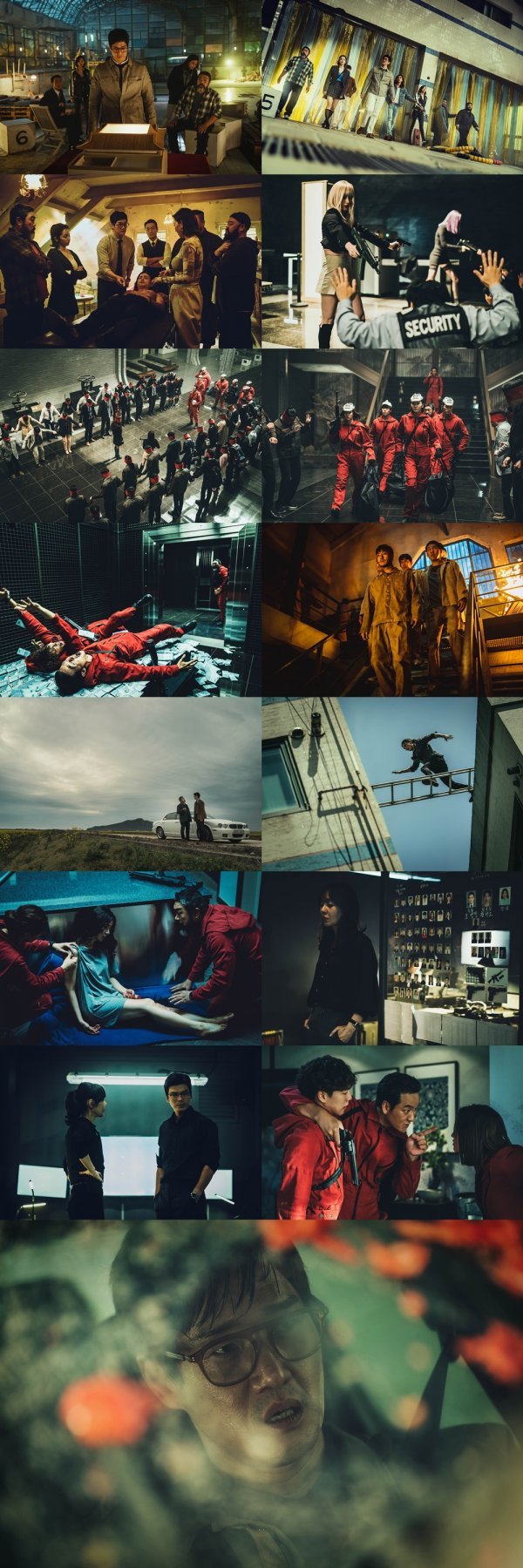 공개된 스틸은 통일 직전 한반도에서 사상 초유의 범죄를 저지르는 강도단과 그들을 저지하려는 남북 공동대응팀 사이의 팽팽한 긴장감이 담겨있다. 먼저 죽어서야 나올 수 있다는 북한 개천 수용소에서 탈출한 베를린(박해수 분)과 길거리 싸움꾼 출신 덴버(김지훈 분) 등 교수(유지태 분)를 중심으로 한자리에 모인 남북한 천재 강도단들의 압도적인 존재감이 시선을 사로잡는다.
