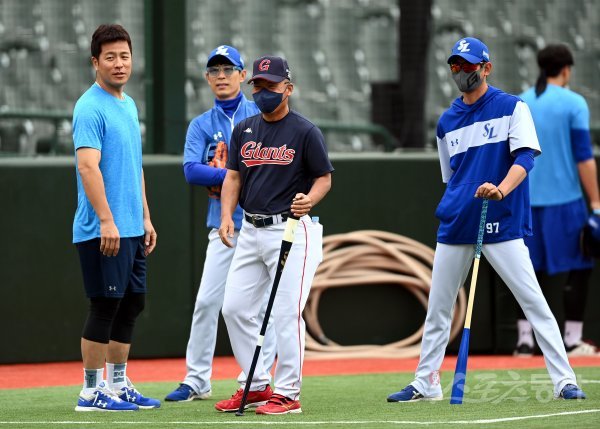 7일 부산 사직야구장에서 ‘2022 신한은행 SOL KBO리그’ 롯데 자이언츠와 삼성 라이온즈의 경기가 열린다. 경기 전 롯데 김평호 코치가 삼성 강민호와 만나 이야기를 나누고 있다.