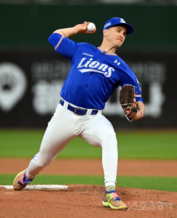 7일 부산 사직야구장에서 ‘2022 신한은행 SOL KBO리그’ 롯데 자이언츠와 삼성 라이온즈의 경기가 열렸다. 삼성 선발투수 뷰캐넌이 힘차게 볼을 던지고 있다.